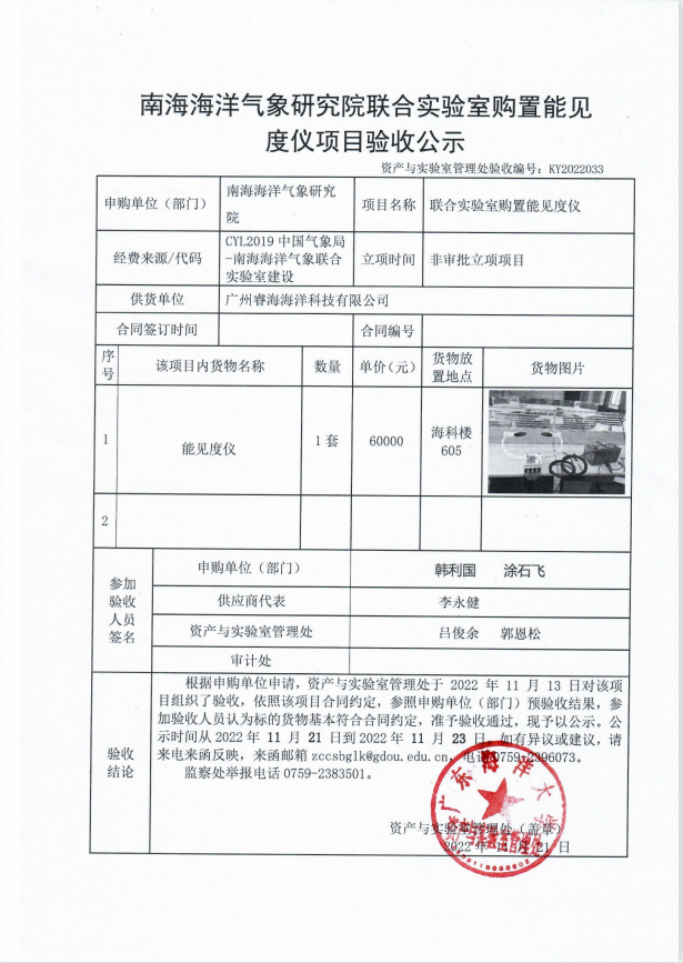 南海海洋气象研究院联合实验室购置能见度仪项目验收公示