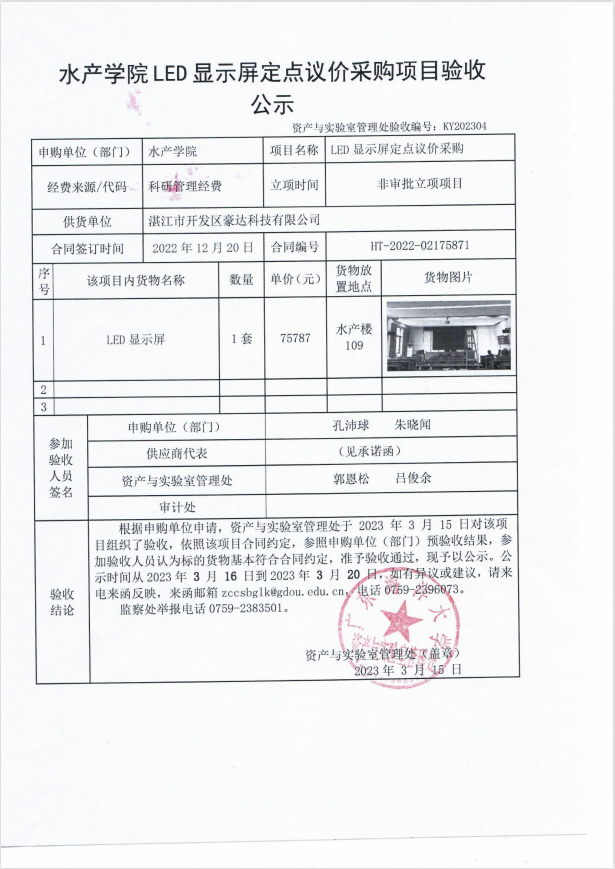 水产学院LED显示屏定点议价采购项目验收公示