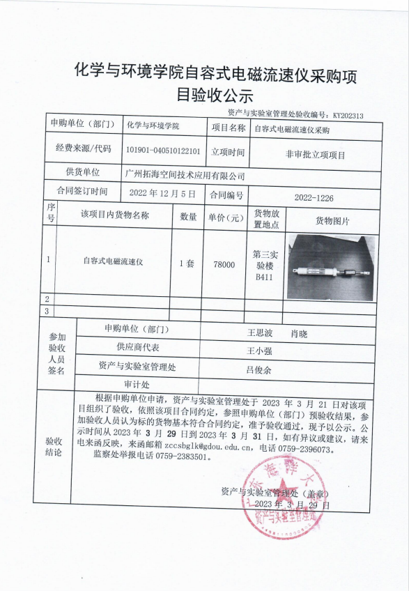 化学与环境学院自容式电磁流速仪采购项目验收公示