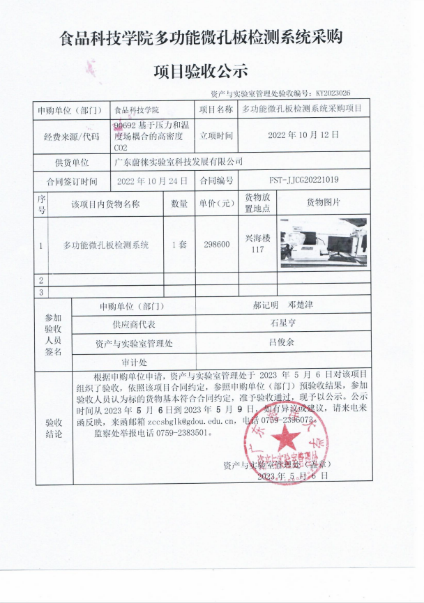 食品科技学院多功能微孔板检测系统采购项目验收公示