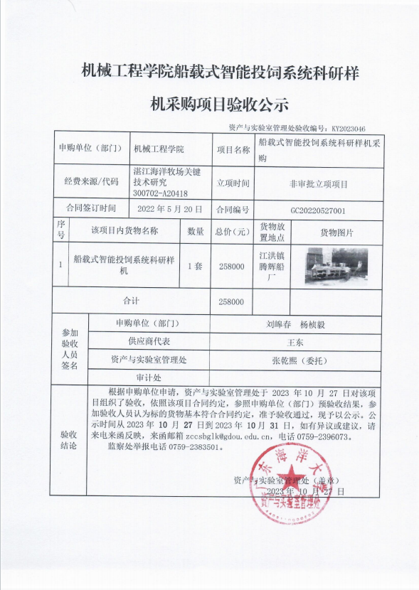 机械工程学院船载式智能投饲系统科研样机采购项目验收公示