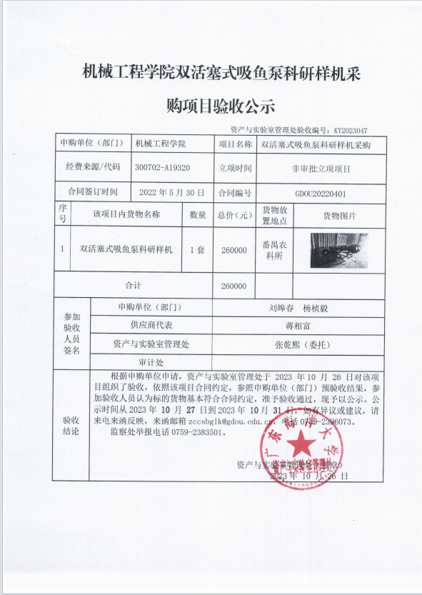 机械工程学院双活塞式吸鱼泵科研样机采购项目验收公示
