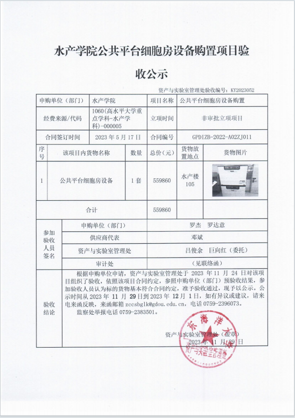 水产学院公共平台细胞房设备购置项目验收公示
