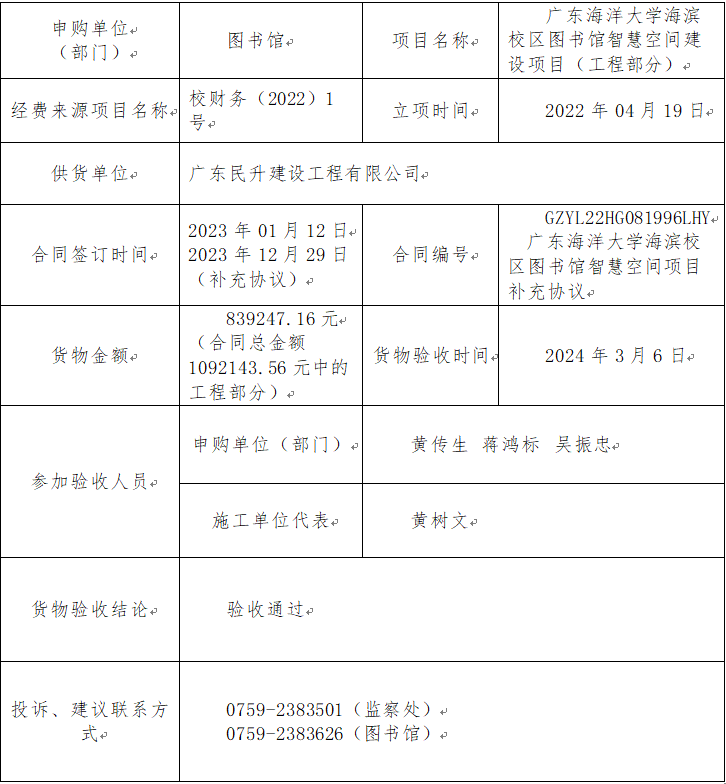 海滨校区图书馆智慧空间建设项目(工程部分)已验收,现将验收结果公示。