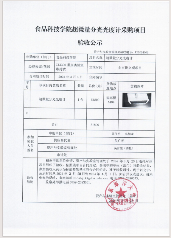 食品科技学院超微量分光光度计采购项目验收公示