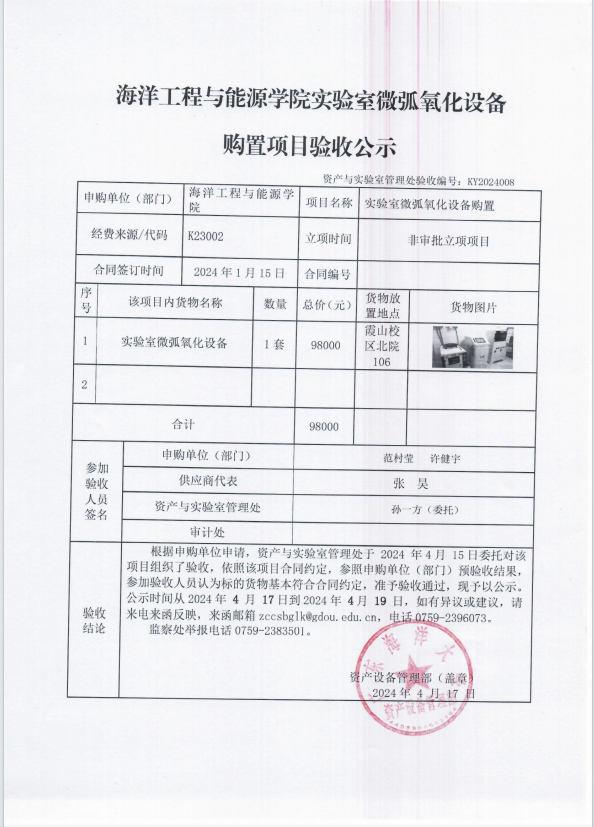 海洋工程与能源学院实验室微弧氧化设备购置项目验收公示