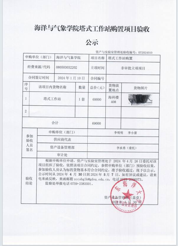 海洋与气象学院塔式工作站购置项目验收公示