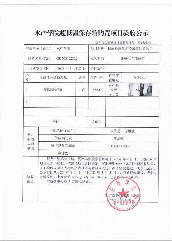 水产学院超低温保存箱购置项目验收公示