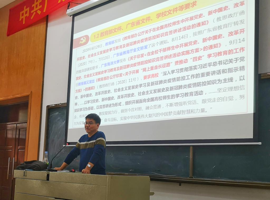 12月2日下午,滨海农业学院组织全体教职工及学生代表在兴农楼109室召开学习“四史”和党的十九届五中全会精神学习宣讲报告会。宣讲会由学校党委理论宣讲团陈青松副教授主讲,学院党委书记邓伟强主持。