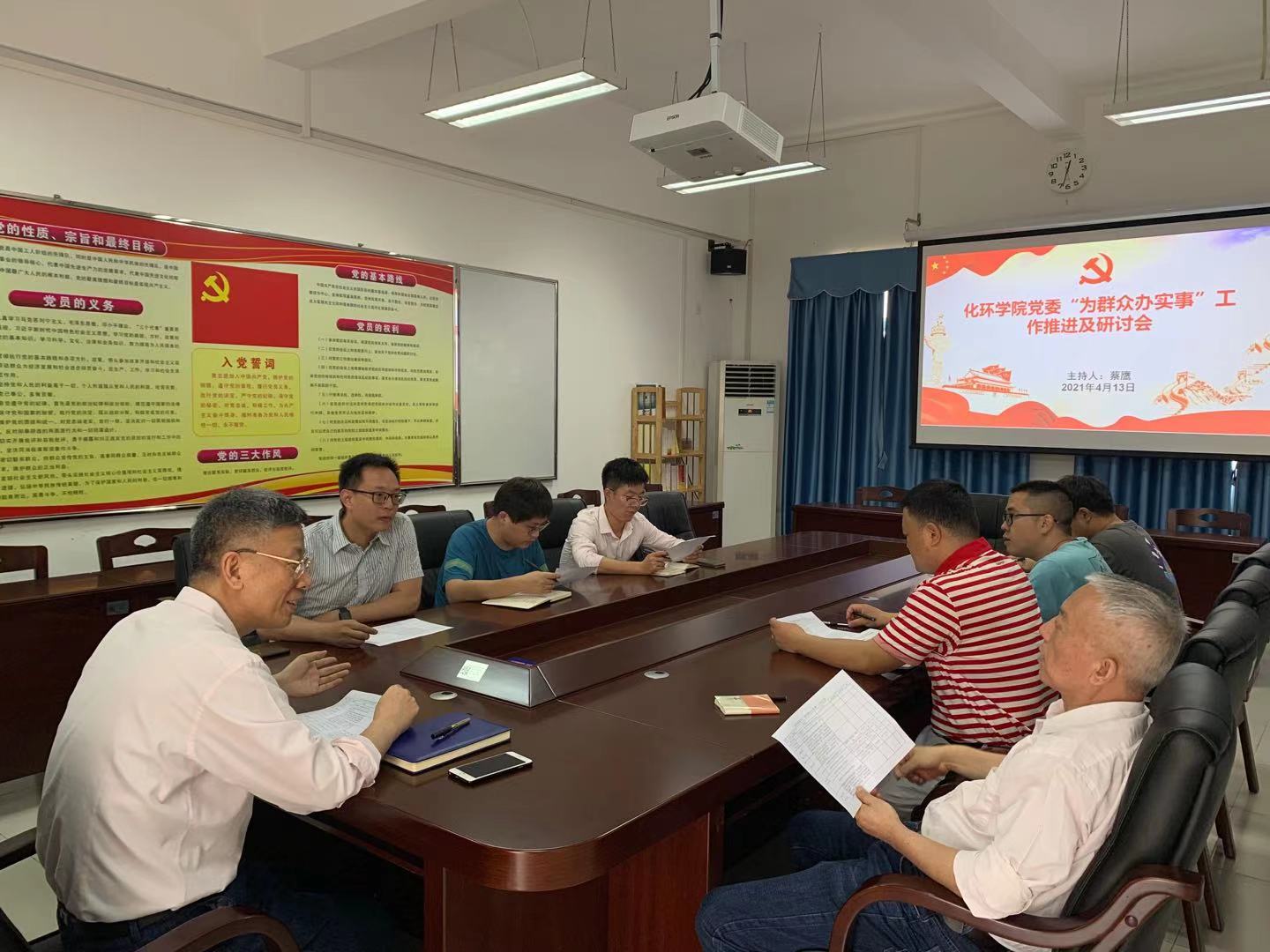为贯彻落实党史学习教育工作,扎实开展“我为群众办实事”实践活动,按照学校党委有关布置和要求以及学院党委工作安排,4月14日,化学与环境学院党委在第三实验楼B302召开“我为群众办实事”工作推进及研讨会,学院党委书记、副书记、各党支部书记参会,会议由学院党委书记蔡鹰主持。