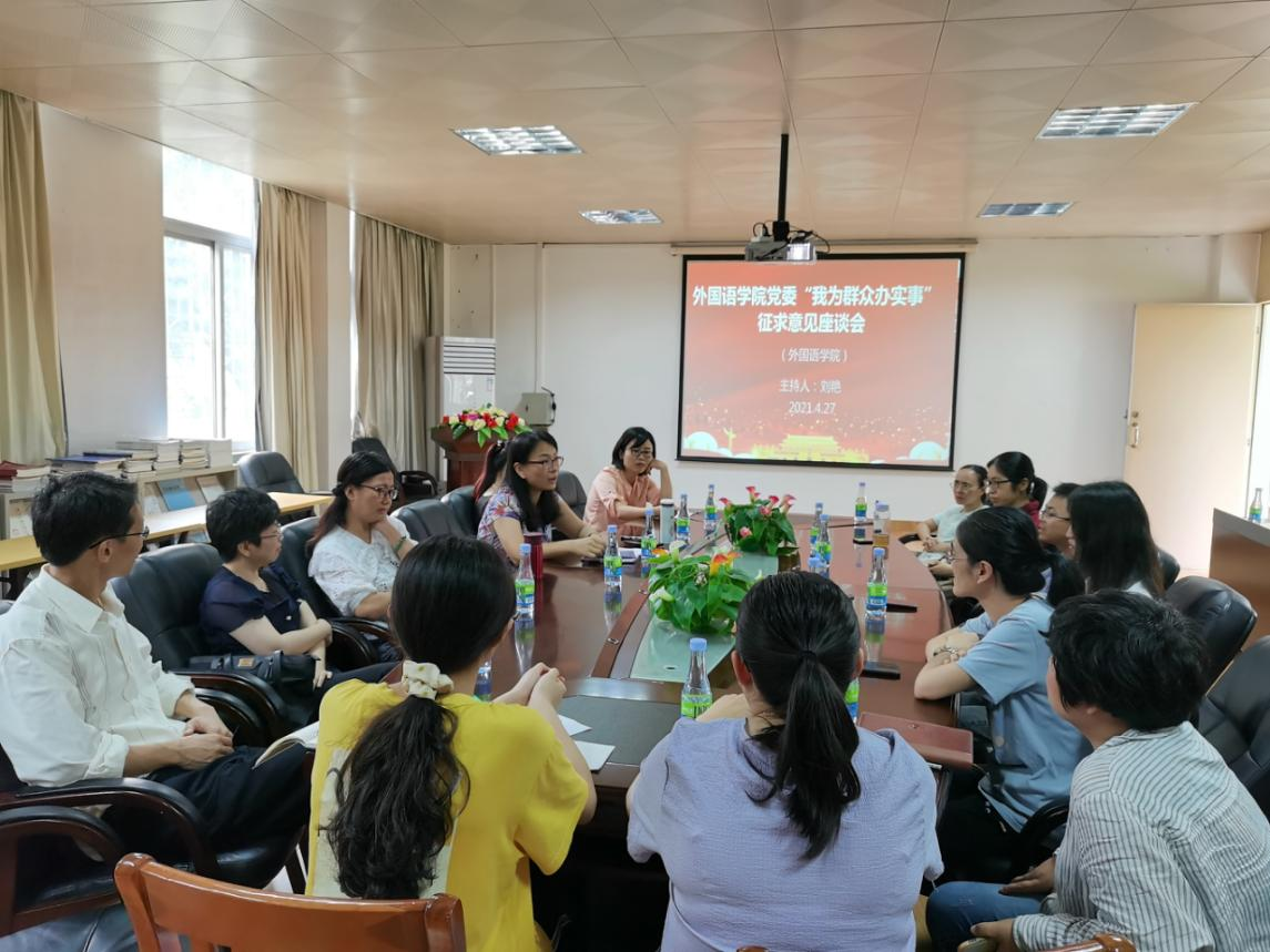 为深入推进党史学习教育工作做实做深,积极落实“我为群众办实事”实践活动,畅通意见沟通渠道,广泛征求群众意见。4月27日,外国语学院在湖光校区兴教楼105召开“我为群众办实事”征求意见座谈会。学院正处级辅导员、党委副书记刘艳主持会议,各系、部、室及中心教师代表、学生代表共17人参加了座谈。