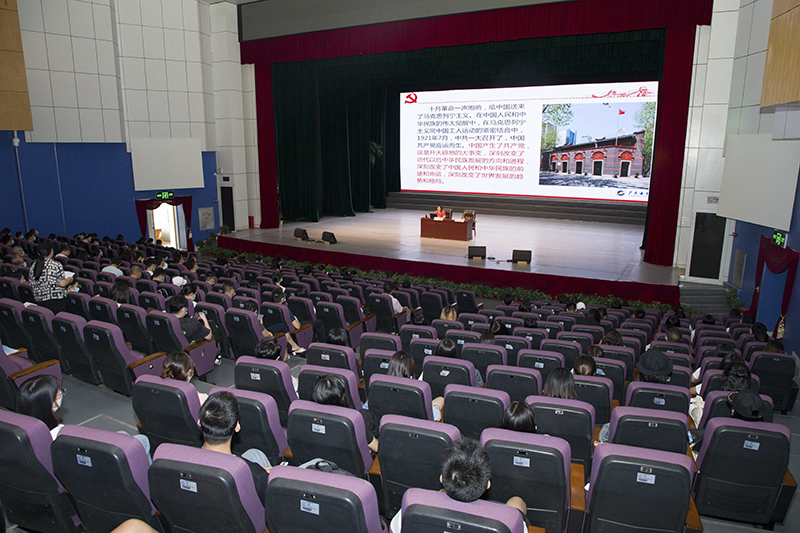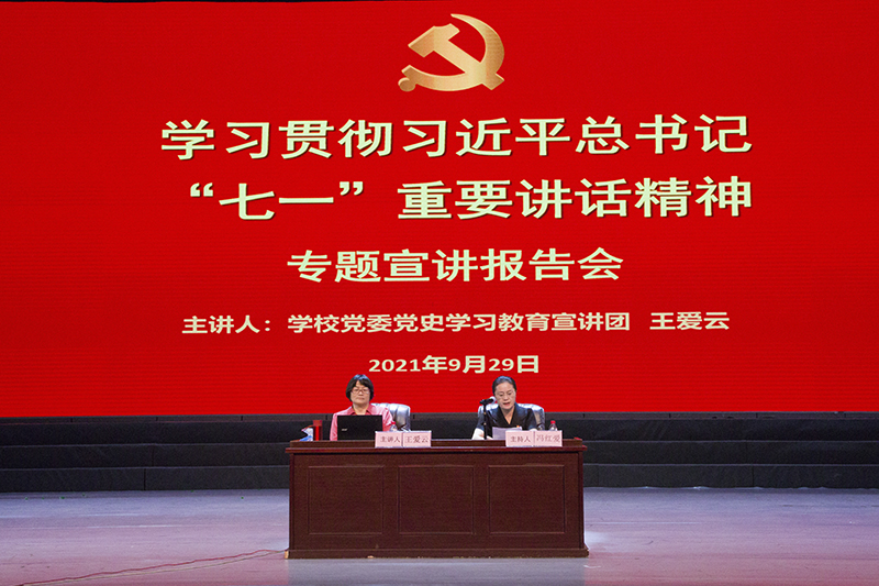 9月29日下午,中歌艺术学院在实验剧场举行学习贯彻习近平总书记“七一”重要讲话精神专题宣讲报告会,全体教职工和学生党员共200余人参加学习。报告会由学校党委党史学习教育宣讲团成员、马克思主义学院王爱云教授主讲,学院党委书记冯红爱主持。