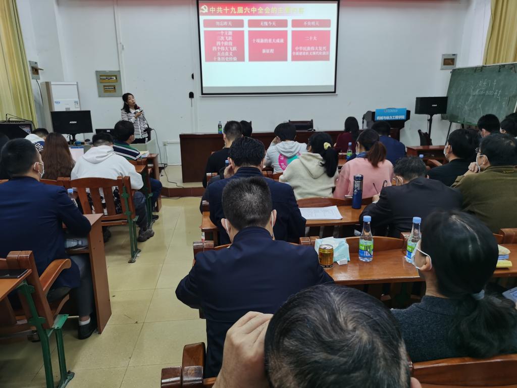 12月22日下午,机械与动力工程学院党委在湖光校区工训中心102会议室举行学习贯彻党的十九届六中全会精神宣讲报告会。学校党委理论宣讲团成员、马克思主义学院教授孙淑秋应邀作专题宣讲,学院全体教职工、学生党员参加报告会,学院党委书记李国芳主持报告会。