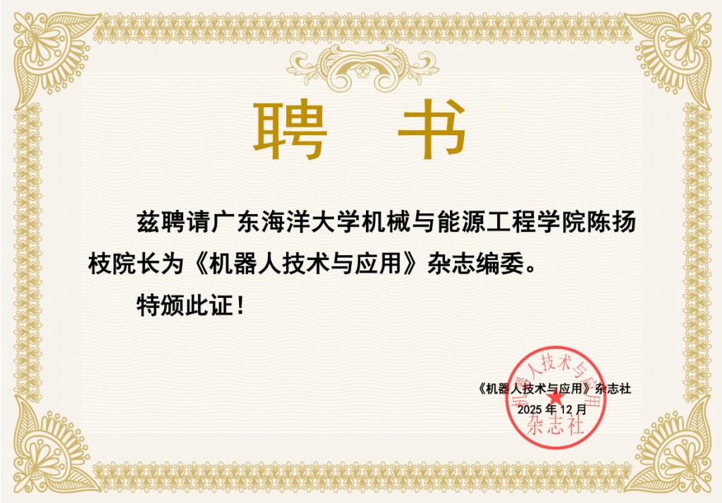 近日,机械与能源工程学院院长陈扬枝教授获聘为《机器人技术与应用》杂志编委会委员。此次聘任是对陈扬枝教授个人学术造诣的充分肯定,更是对学院在机器人技术与工程领域研究实力与影响力的认可。