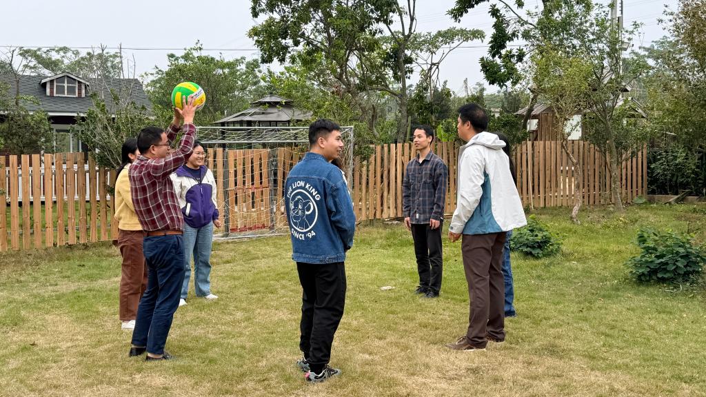 活动首站,教职工们怀着崇敬之情走进阳江县委旧址红色教育基地。通过参观历史文物、珍贵图片和文献资料,共同追忆革命先辈的奋斗足迹与峥嵘岁月,在沉浸式参观学习中感悟革命精神的时代内涵。随后,队伍转至人间烟火休闲园开展团建活动。活动伊始,夏杏洲向全体教职工致以诚挚问候,号召大家在努力工作的同时保持积极心态,以更强健的体魄和更饱满的热情投入到工作中。杨新河充分肯定了大家一年来对工会工作的支持,特别提到在校运会中我院教职工团结拼搏斩获团体第四名佳绩,并提前致以新年祝福。温暖有力的话语让现场氛围愈发浓厚。紧接着,“排球萝卜蹲”、“协作传球”等精心设计的互动游戏有序开展,现场笑声不断,气氛热烈。教职工们在默契配合中增进了解,在欢声笑语中舒缓了压力,在挑战协作中提升团队凝聚力与战斗力。