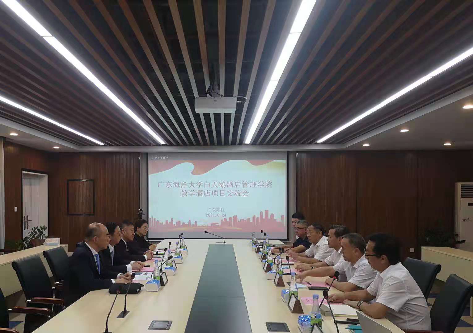 2021年8月24日下午,开云kaiyun登录入口白天鹅酒店管理学院教学酒店项目交流会在阳江校区海行楼5楼会议室举行。校长潘新祥,校党委常委、副校长、阳江校区党委书记、管理委员会主任宁凌,学校人事处处长、阳江校区党委副书记、管理委员会常务副主任洪鹏志,商学院负责人李力、唐志军和广州白天鹅酒店集团总经理张添,副总经理刘斌,行政部总监陈曦、白天鹅培训学校副校长陈晞等参加了交流会。