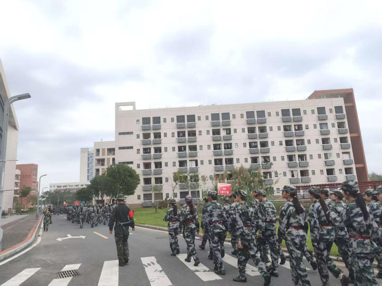 接下来的14天,在承训部队教官的严格指导与耐心带教下,一场场紧张有序的训练在训练场铺展开来。这不仅是军事技能的锤炼,更是意志与担当的磨砺。从晨光熹微时的站军姿开始,到正午烈日下的方阵训练,再到暮色中的战术演练,每个动作都力求标准,无论多么辛苦也没人喊放弃。九月的广东天气无常,烈日常把迷彩服浸出层层盐渍,骤雨又会瞬间浇透衣背,学子们抹一把脸上的水——分不清是汗水还是雨水,依然咬牙跟上训练节奏。更难忘台风过境前夕,狂风卷着乌云压向操场,教官临时调整训练方案,学子们挤在雨棚下,反复揣摩队列动作要领。承训教官看着浑身湿透却眼神发亮的学子,忍不住感慨“这股韧劲,不输军人!”正是这样的坚持,让5营学子一步步掌握了站军姿、走方阵、战术演练等各项军事技能,也让“坚韧不拔”成了这段时光最鲜明的注脚。