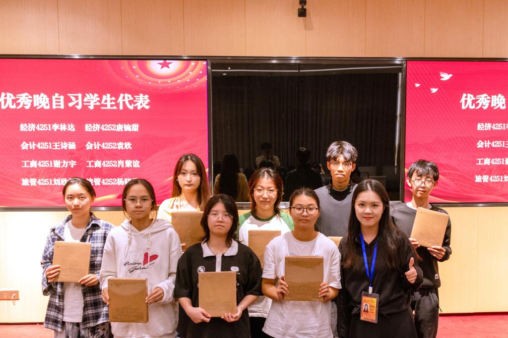 本次表彰活动紧扣晚自习建设成效,以多元荣誉为笔,勾勒新生勤学笃行的青春模样。其中,旅管4252、经济4252、会计4252三个班级凭借严谨的组织管理与浓厚的学习氛围,斩获优秀晚自习前三班级殊荣;旅管4251、经济4251、会计4251、工商4251、工商4252等班级,因推动班级晚自习建设稳步进阶、成效显著,斩获晚自习进步奖。此外,经民主推举脱颖而出的8名优秀晚自习学生——经济4251李林达、经济4252唐婉甜、会计4251王诗涵、会计4252袁欣、工商4251谢方宇、工商4252肖紫谊、旅管4251刘欣阅、旅管4252杨晓君,凭借专注自律的学习态度斩获专项奖品及奖励。前程似锦,灯暖如初。学风建设的暖意浸润每一位新生学子,让这份鼓励传递至每一位2025级学子心间。