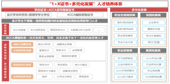 广东海洋大学商学院会计学专业ACCA创新实验班在保留会计学专业主干课程基础上,将ACCA课程与会计学专业部分课程进行了有效替换和补充,并为会计学专业ACCA创新实验班单独设置了贯穿大学四年全程的丰富多元化发展的学习实践活动,形成特色鲜明的“1+X证书+多元化发展”人才培养体系。