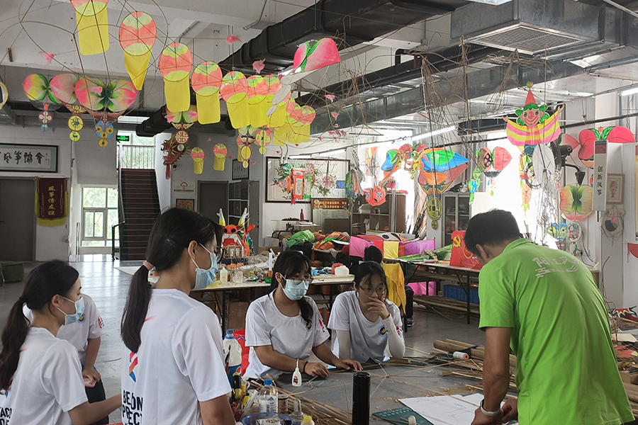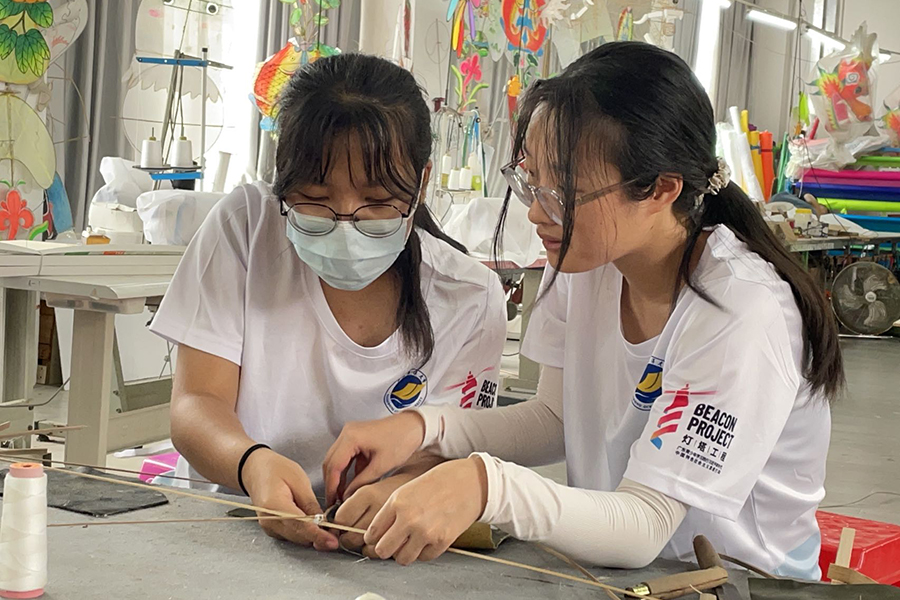 图为实践队成员在阳江风筝馆向传承人梁治昂学习制作风筝。谭港民 供图