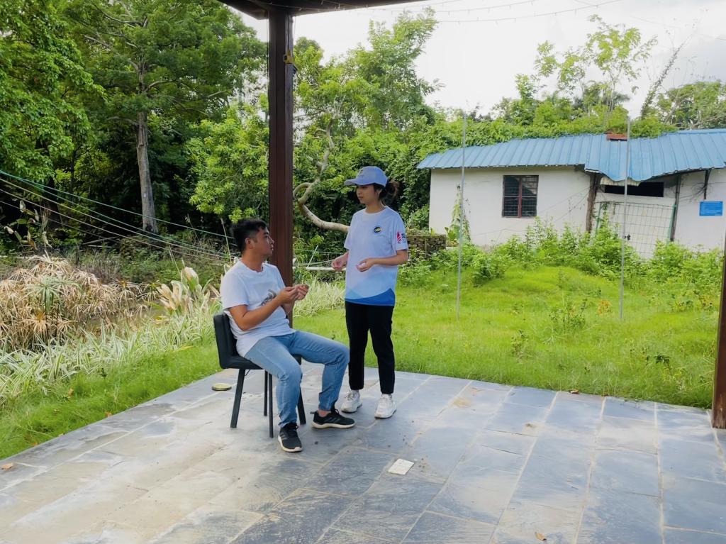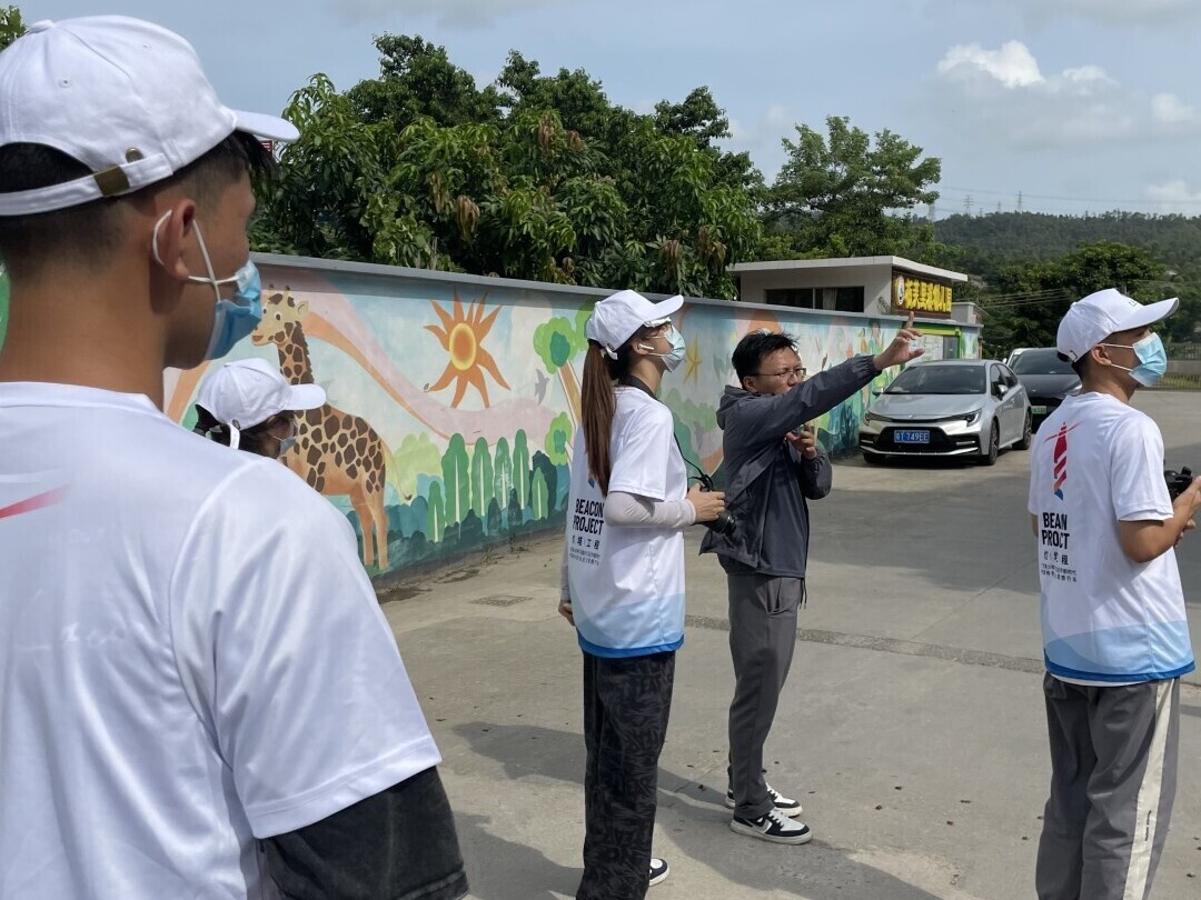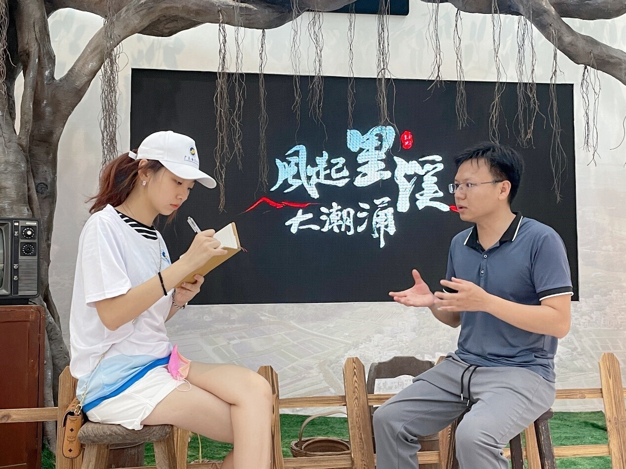 图为团队成员在里溪村的党员教育基地内的里溪村历史展馆对工作人员进行访谈,了解村内现如今“联产到劳”的政策情况与立足于大湾区新时代的里溪村的新发展规划与面貌。罗紫卉供图