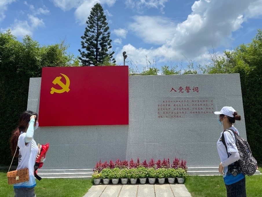 图为团队内的入党积极分子成员面对孙中山故里旅游区内的党旗敬礼,诵读入党誓词,表达对党的深厚崇敬之情。罗紫卉 供图