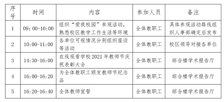 为进一步加强教师队伍建设,鼓励教职工做师德高尚、敬业爱岗、乐于奉献的新时代高校教师,不忘初心、凝心聚力,经校区管委会研究决定,结合《开云kaiyun登录入口2021年教师节庆祝表彰大会工作方案》,定于9月10日组织全体教职工开展阳江校区首届教师节庆祝活动,现将活动安排通知如下: