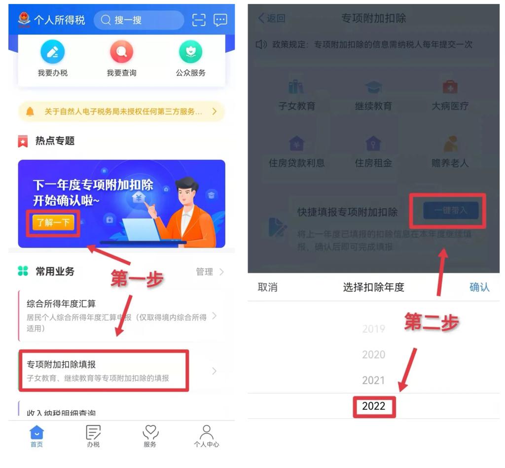 1.APP首页,点击【了解一下】或【专项附加扣除填报】,点击【一键带入】,选择扣除年度2022。