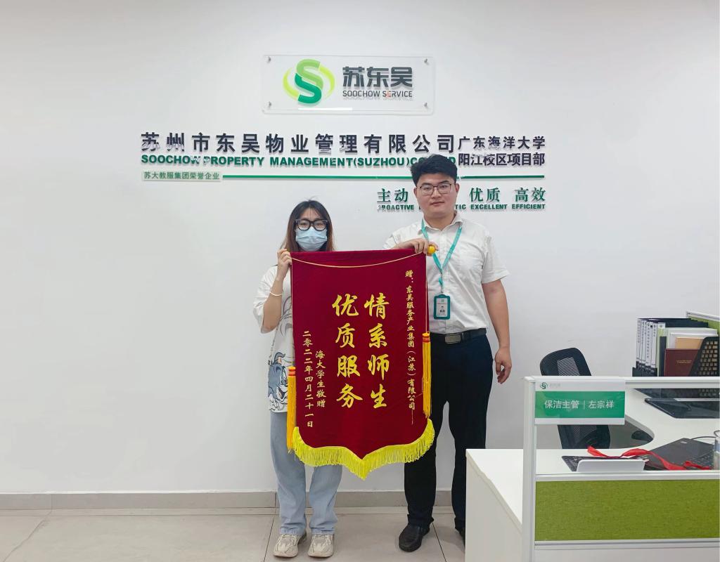 4月9日晚11点,刘同学在宿舍突发高烧,苏东吴物业公司收到消息马上向相关部门汇报,并第一时间派车将学生送至市区医院发热门诊就诊。在该同学就诊过程中,物业服务人员全程陪伴并细微照顾,直至凌晨2点,学生退烧且核酸检测结果出来后才将学生安全送回校区。物业服务人员这一普通的举动,却赢得了同学的高度认可和真情点赞,于是就有了先前学生到办公室赠送锦旗那温馨的一幕。