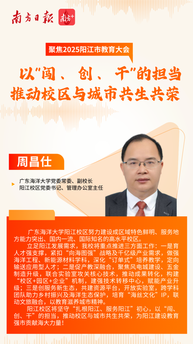 阳江校区将坚守“扎根阳江、服务阳江”初心,以“闯、创、干”的担当,推动校区与城市共生共荣,为阳江建设教育强市贡献海大力量!