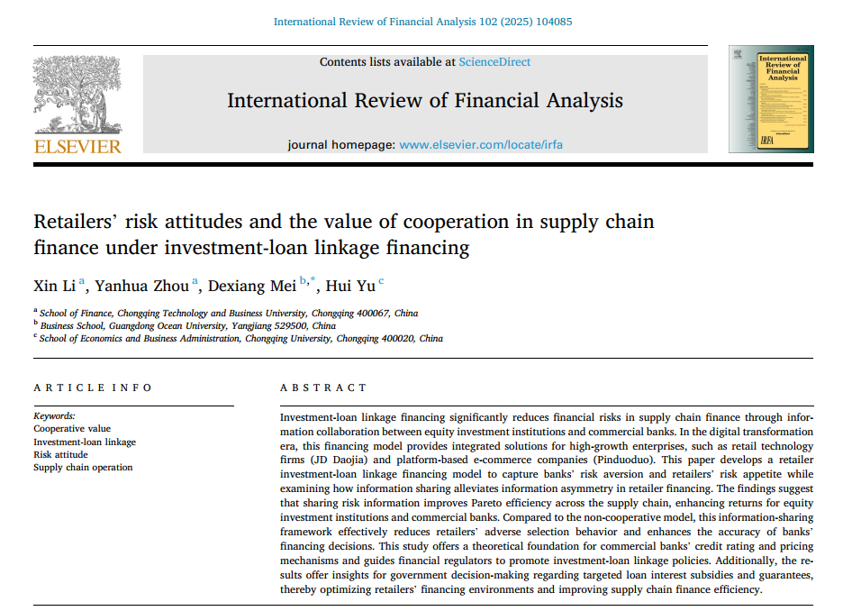 阳江校区商学院经济学专业梅德祥教授近期以通讯作者身份在国际金融领域顶级期刊《International Review of Financial Analysis》(简称IRFA)发表题为“Retailers' risk attitudes and the value of cooperation in supply chain finance under investment-loan linkage financing”高水平学术论文。IRFA是金融学领域国际公认的重要期刊,旨在发表金融与公司财务等领域的高质量理论与实证论文,是JCR经济学一区,财政与金融类Top期刊,2023-2024年影响因子7.5,五年影响因子7.7。这也是开云官网首位学者在该期刊发表高水平学术论文。