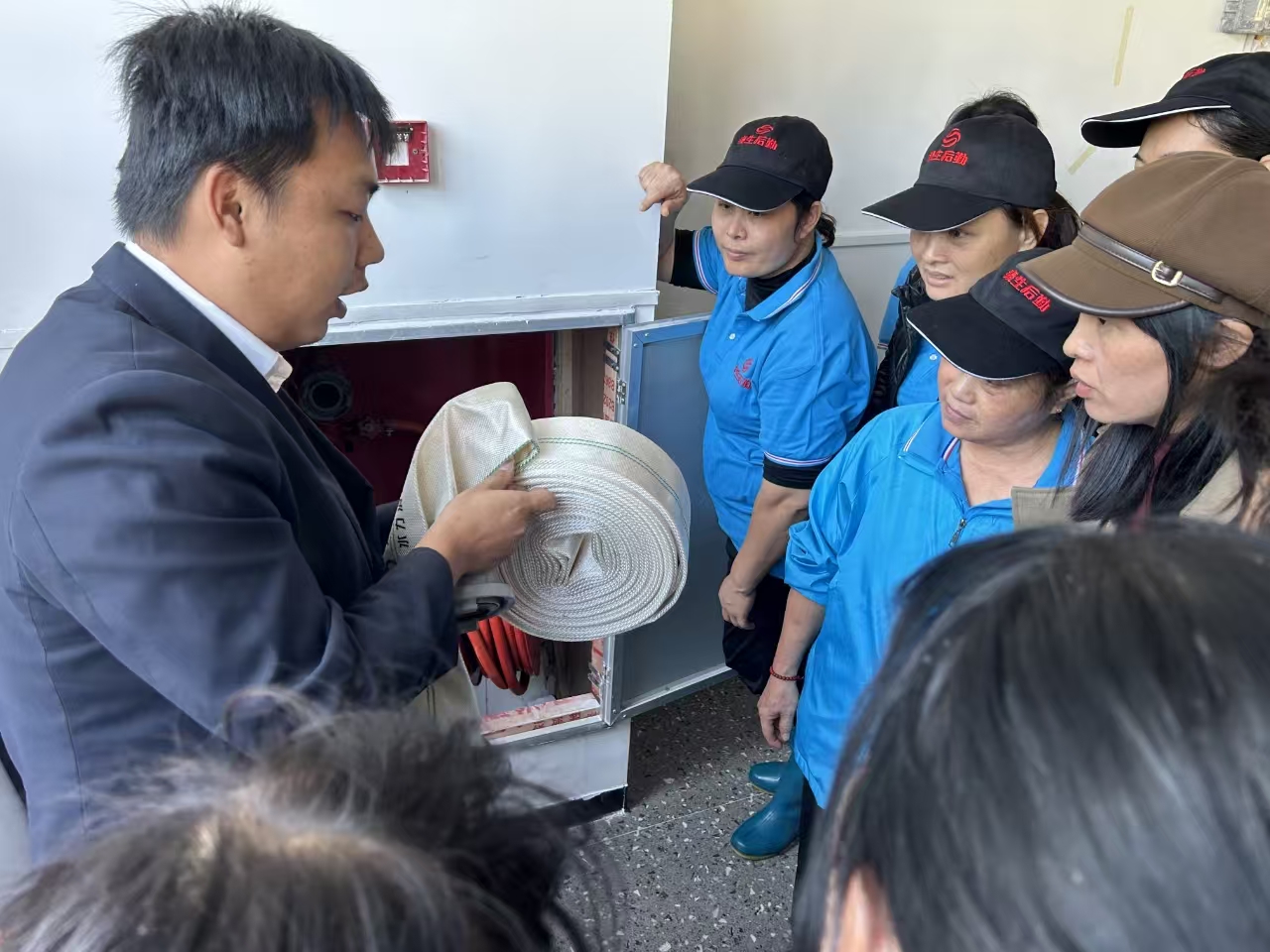 培训现场,相关专业人员通过PPT、视频等多媒体资料向全体参培人员普及了消防安全法律法规知识、消防安全基础知识以及食堂火灾隐患及预防措施等内容,重点介绍了油锅起火、电线起火的特点和灭火要点,以及便携式灭火器的使用方法及注意事项。讲师还传授了自救的基本技巧,包括火灾报警、疏散逃生和触电后解救等操作,让员工们在理论学习的同时,也掌握了一定的实操技能。