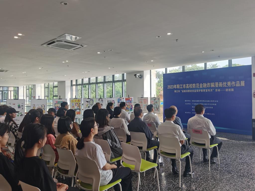 近日,学生事务部在校区图书馆举办了2023年阳江市高校防范金融诈骗漫画优秀作品展暨金融消费者权益保护宣传活动,国家金融监督管理总局阳江监管分局局长刘小群、副局长徐志莲,中国银行股份有限公司阳江分行行长肖华,阳江市银行业协会副会长谭飞,阳江校区党委委员、管委会副主任陈永强以及学生事务部副部长翁江峰出席活动并为获奖同学颁奖。随后,商学院李力院长陪同参观了济航楼。