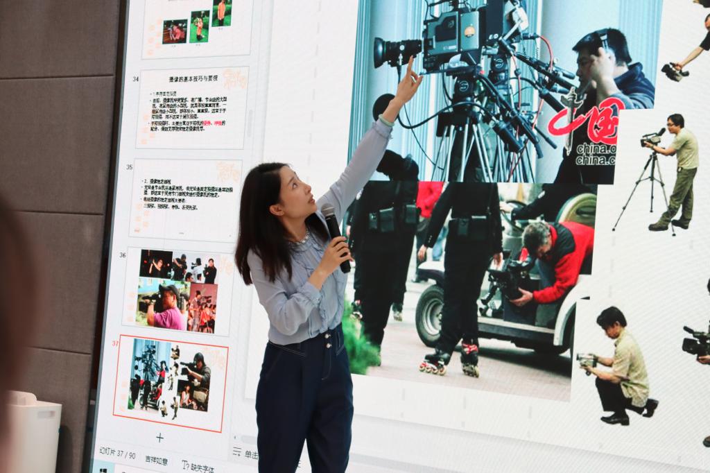 课上,张欢老师为同学们讲解了新闻的定义、要素和文体,以及基础拍摄手法。张欢老师指出,新闻具有时效性、真实性、新奇性的特点。因此,撰写新闻稿件时,稿件要具体体现新闻的特点,不仅要快速、客观,以第三方视角看待,而且标题与内容要准确具体,与实际相符合。新闻稿体裁多样,有消息、通讯、新闻特写、新闻专访、会议新闻等。除此之外,张欢老师还为同学们讲解了拍摄手法,如突出主题、科学构图、科学用光等。拍摄方法如手持、固定器、多机位等,强调拍摄时要保持平、稳、准、匀。最后,张欢老师带领同学们近距离接触了拍摄设备,并详细讲解其使用方法及用途。
