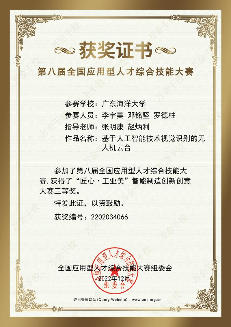 其中参赛学子叶昊、张昶、姜域的《基于渣土车车尾牌照双色识别设计》和参赛学子陈培霖、陈明杰、邓钊昌的《基于新型垂直轴风力发电装置优化城市照明系统》获得了“匠心·工业美”智能制造创新创意大赛二等奖。参赛学子张玉书、李军、黄垲狄的《基于仿生蜘蛛水下捕捞机器人》、参赛学子廖星、李梓健、范宏熙的《面向海上风电运维的无人机轻量化设计与3D打印制造》和参赛学子李宇昊、邓铭坚、罗德柱的《基于人工智能技术视觉识别的无人机云台》获得了“匠心·工业美”智能制造创新创意大赛三等奖。