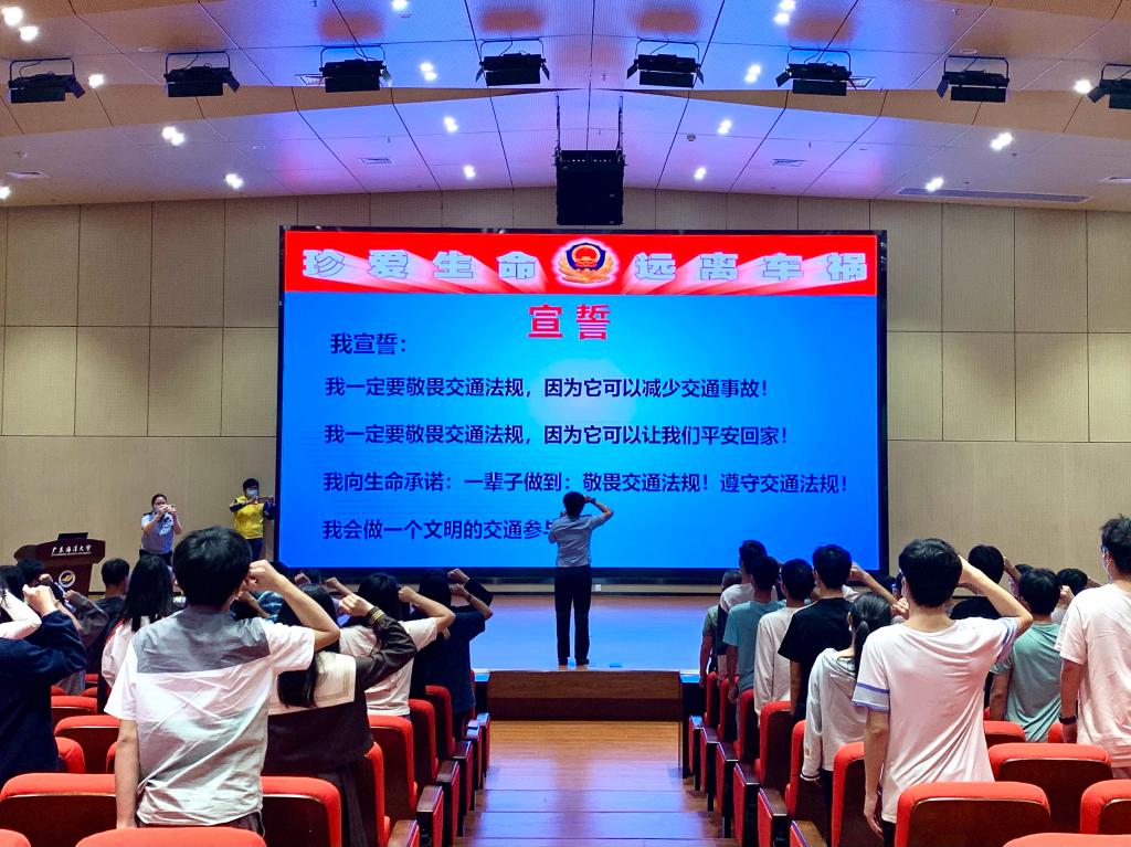 最后,敖警官带领在场的同学们进行宣誓,要求每一位同学都应当敬畏交通法规,遵守交通法规,在日常生活中做一个文明的交通参与者。