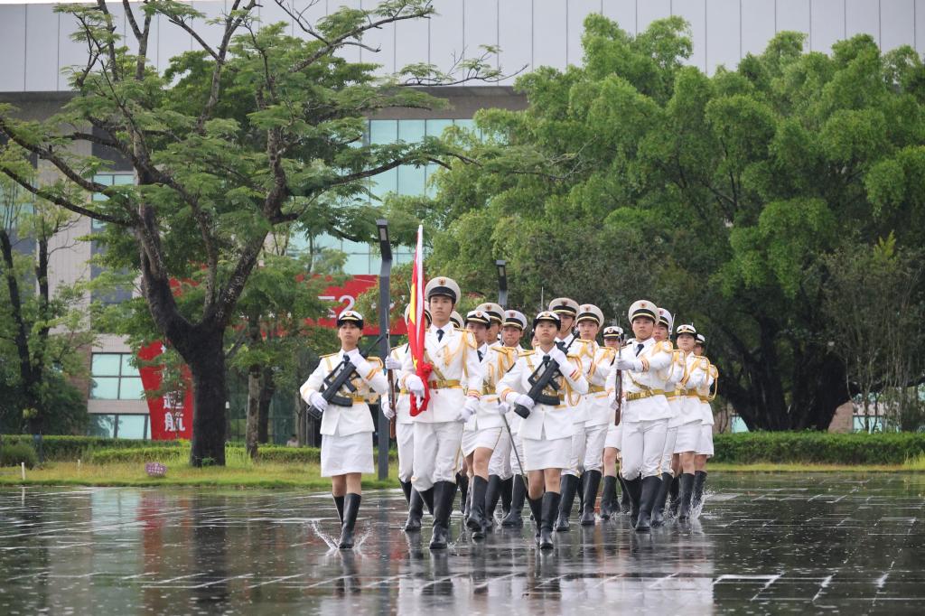7时整,细雨如丝。国旗护卫队,英姿飒爽,步伐整齐、铿锵,护送国旗入场。伴随着雄壮的国歌声,全体师生行注目礼,鲜艳的五星红旗冉冉升起。
