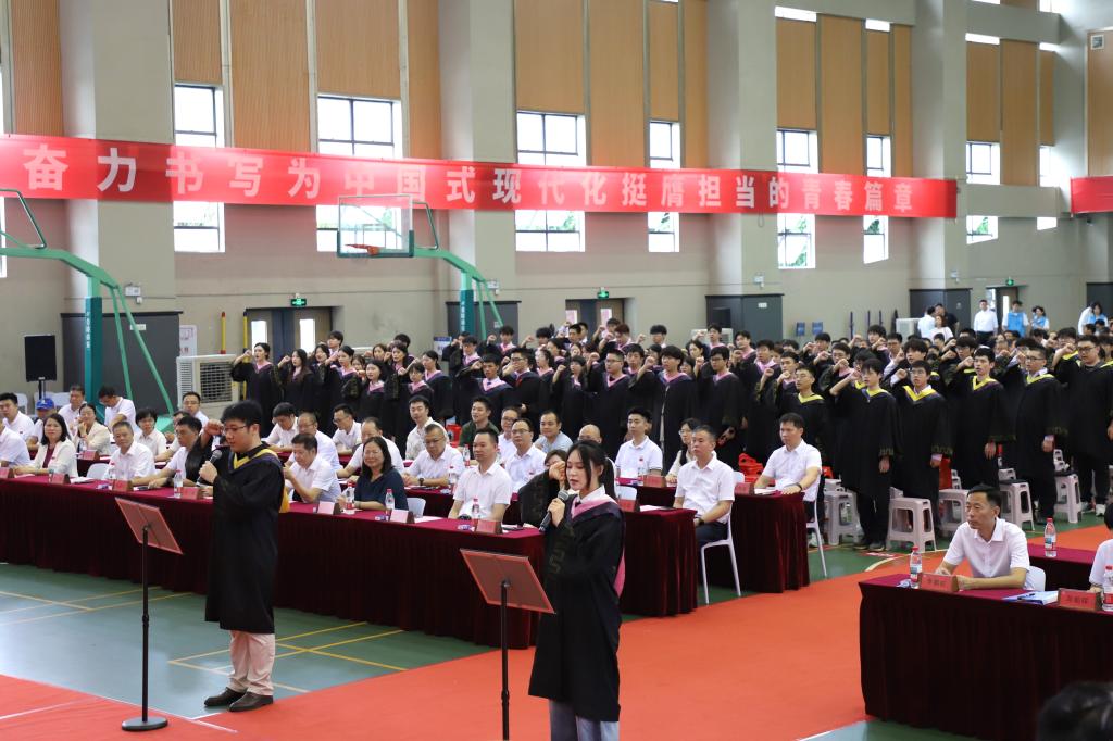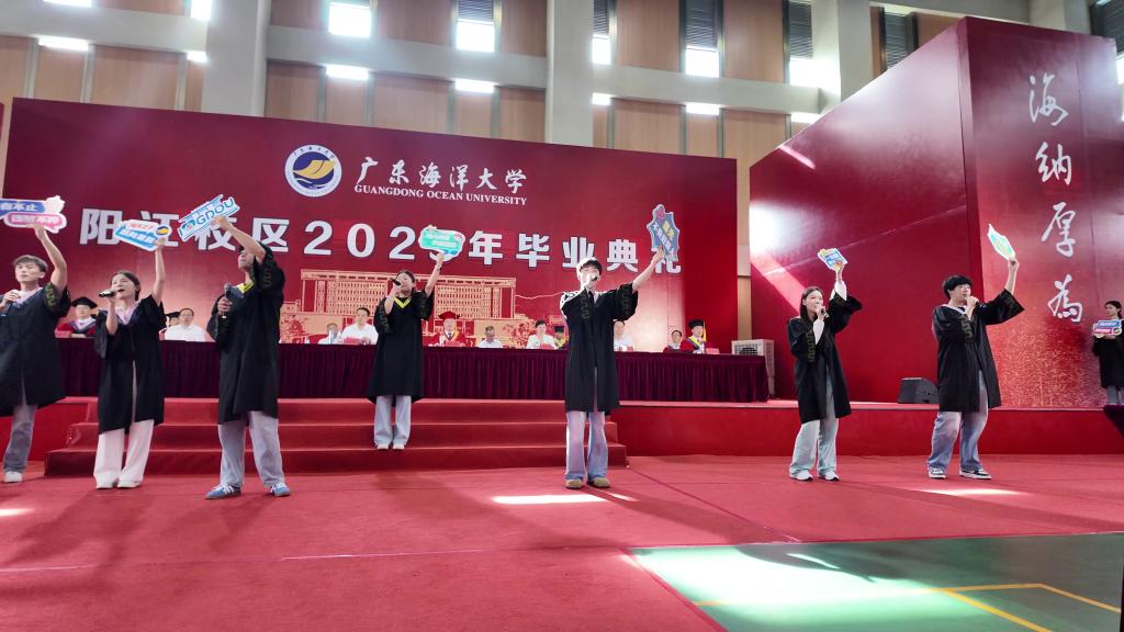 本科毕业生代表、材料成型与控制工程专业毕业生赵律清表示,作为校区首届学子,历经挑战亦收获成长,未来将带着校训精神,勇担使命,砥砺前行。研究生毕业生代表、食品加工与安全专业毕业生刘丽燕同学表示,自己是阳江人,也是阳江校区首届硕士毕业生,深感荣幸与自豪。会计学专业毕业生曾烁飒同学家长庞红梅女士表示,非常感激学校对孩子的悉心培养,孩子从青涩懵懂到独立担当,专业知识与精神品格双丰收。教师代表机械与能源工程学院张明康副教授表示,作为阳江校区首批教师,见证学生四年成长蜕变,希望同学们以坚定信念迎接挑战,勇敢地去追求自己的热爱,去创造属于自己的精彩人生。毕业生宣誓,承诺将恪守“广学明德,海纳厚为”校训,阳光团结,主动实干;传承“坚韧不拔,自强不息”精神,扎根沃土,坚毅前行。致敬师恩环节,12名校园教职工代表上台,接受毕业生献上的鲜花。一束束鲜花,不仅代表着学子们的敬意,更是对教职工在平凡岗位上非凡坚守的诚挚感谢。