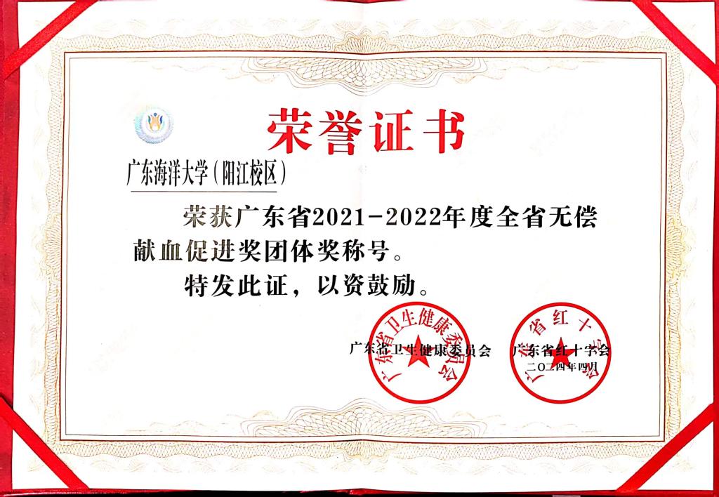 在活动现场,会议宣读了《广东省卫生健康委广东省红十字会关于2021—2022年度全省无偿献血先进团体和个人获奖名单的通报》,并对获奖代表及单位进行表彰,阳江校区荣获“广东省2021-2022年度无偿献血促进奖(团体奖)”称号。