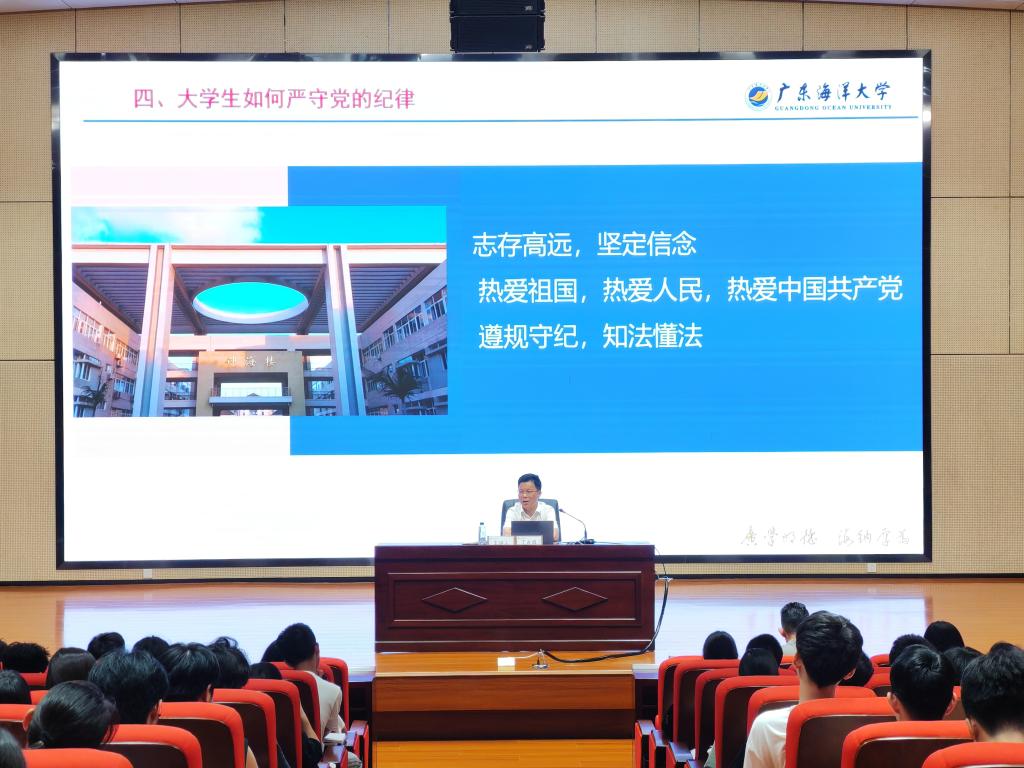 5月22日晚,阳江校区党委副书记丁永成以《学党纪,建新功,争做新时代优秀大学生》为题,在海纳楼113报告厅开讲“树人大讲堂”第一期。校区学生预备党员、入党积极分子、共青团员代表及学工老师代表等近300人参加了活动,活动由学生事务部部长孙学甫主持。
