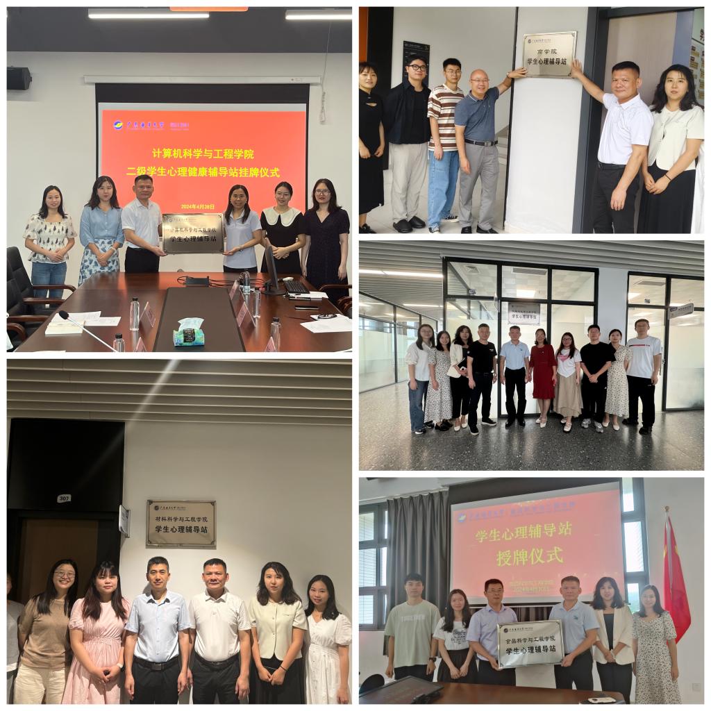 为加强各学院学生心理健康教育工作交流,了解并协助各学院及时解决心理工作中遇到的困难,学生事务部临时负责人翁江峰、心理中心老师王楠、叶惠玲、学生管理老师陈凤一行4人于4月28号至30日,对计算机科学与工程学院、材料科学与工程学院、商学院、机械与能源工程学院、食品科学与工程学院共五个学院逐一进行心理健康教育工作专题调研走访,并举行了学院二级心理辅导站授牌仪式。各学院党总支刘利群、李毅、植秀成、周荣伟、夏杏洲,全体辅导员、班主任代表等分别参加调研活动。