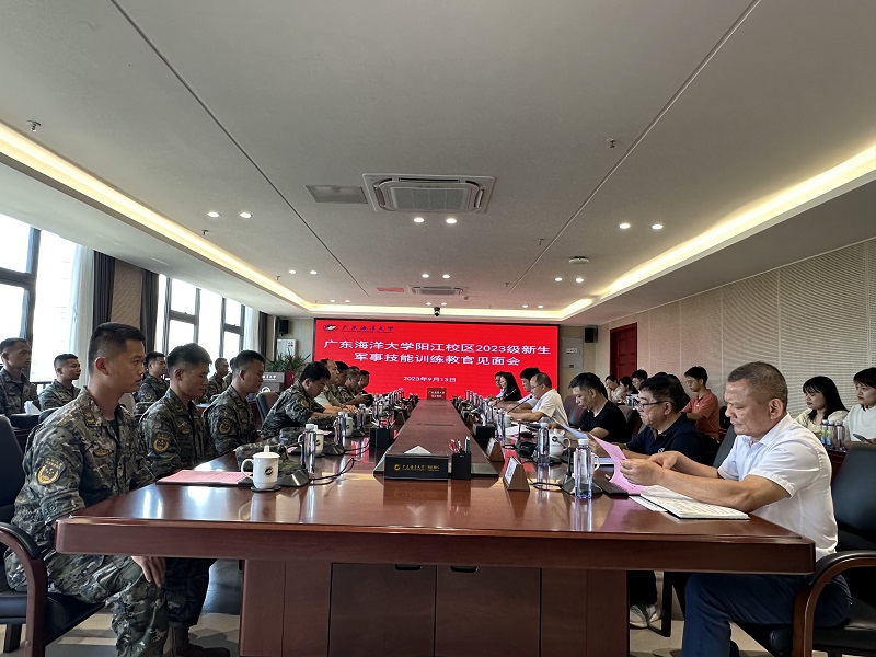 9月13日下午,阳江校区2023级新生军事技能训练教官见面会在海纳楼712会议室进行。军训团相关领导、全体承训教官、各学院学生工作负责人、各学院辅导员以及学生事务部相关工作人员参加会议。会议由学生事务部部长、军训团副团长邓朝晖主持。