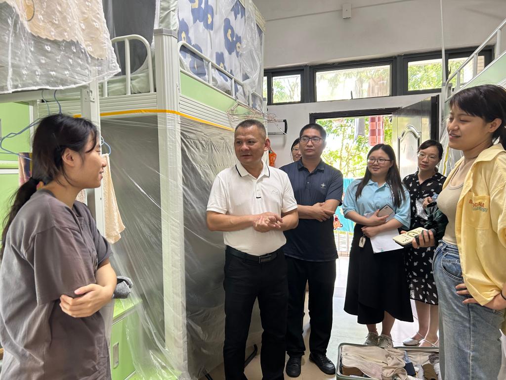 7月6日下午,阳江校区学生事务部第二负责人翁江峰带队宿舍管理负责人、学生事务部老师以及学院辅导员代表一起走访学生宿舍,了解学生最新离校动态。