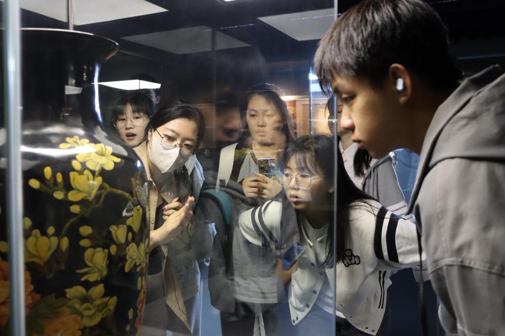 随后,师生一行来到阳江漆艺院。阳江漆艺院是“国家非物质文化遗产项目保护单位”,内设“阳江漆器博物馆”。在阳江漆器博物馆内,师生共同观看了阳江漆艺的文化宣传视频,陆续参观了阳江市漆器历史展厅、漆艺精品展厅、漆器基础制作工坊、漆器文创产品展厅等。阳江漆器悠久的历史背景,高超的艺术造诣无不让人叹为观止。