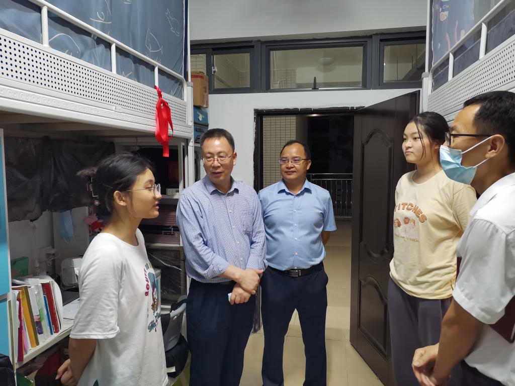 彭权群率队先后实地走访了阳江校区的饭堂、学生宿舍及辅导员办公室,和师生亲切交谈,送上学校的关心和问候。听到很多学生有考研意向,有的已经参军入伍,彭权群非常高兴,对同学们潜心读书、心怀远方的精神面貌给予充分肯定,他勉励同学们要积极响应学校防疫规定和日常管理,珍惜大学时光,认真学习,为未来发展做好人生规划。同学们对学校领导的暖心关怀表示感谢,纷纷表示将以高昂的状态投入到学习生活中,奋发有为、不负韶华。
