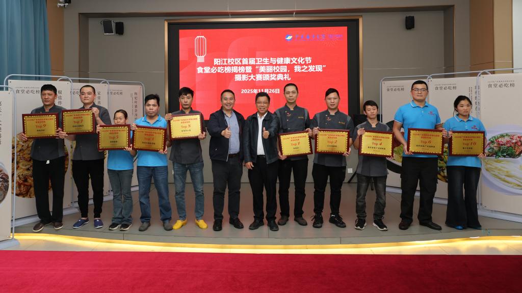 在“食堂必吃榜”揭榜环节,现场发布了最受师生欢迎的十佳菜品视频。麦冬宁为获奖食堂代表颁发牌匾,嘉禾食苑经理林华凯与桃李食苑经理丘胜伟分别发言,表达了对师生支持的感谢与持续提升餐饮服务的决心。