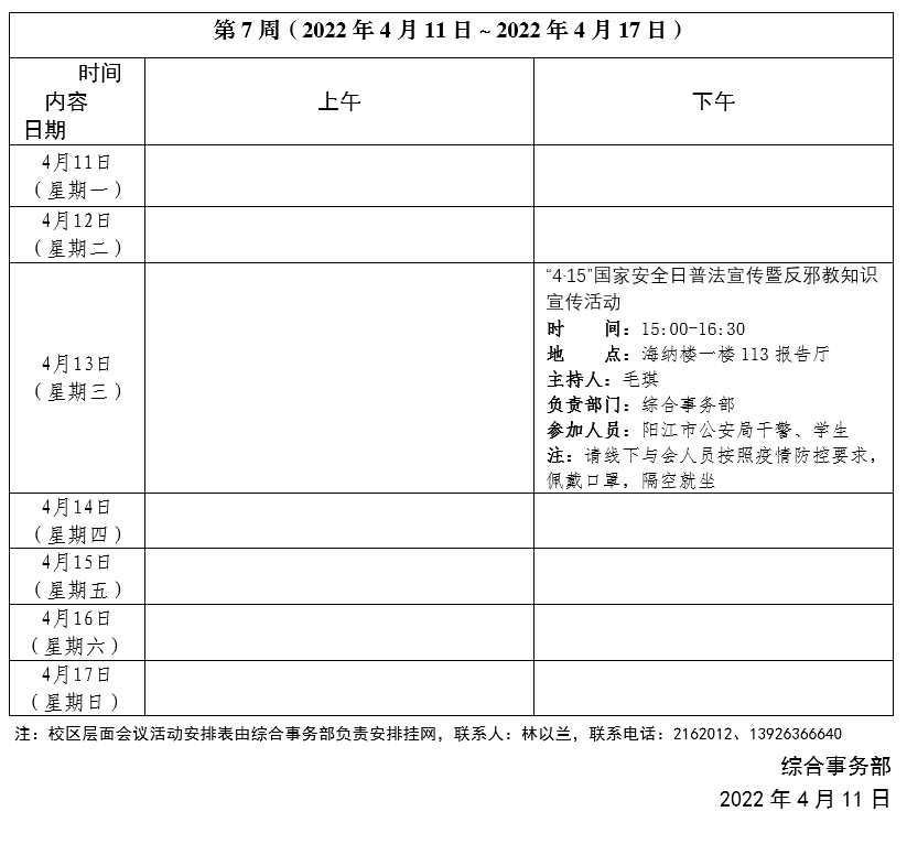 2021~2022学年第二学期第7周会议活动安排表