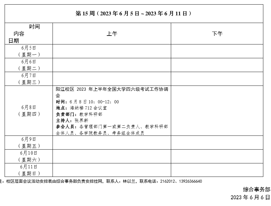 2022~2023学年第一学期第15周会议活动安排表