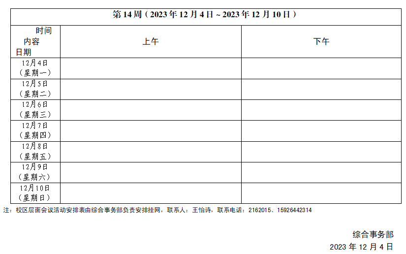 2023~2024学年第一学期第14周会议活动安排表