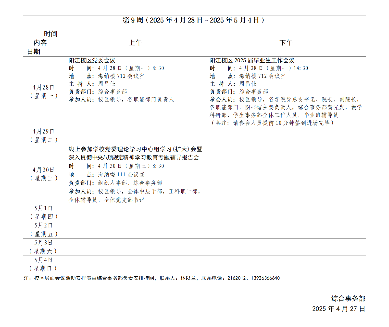 2024~2025学年第二学期第9周会议活动安排表